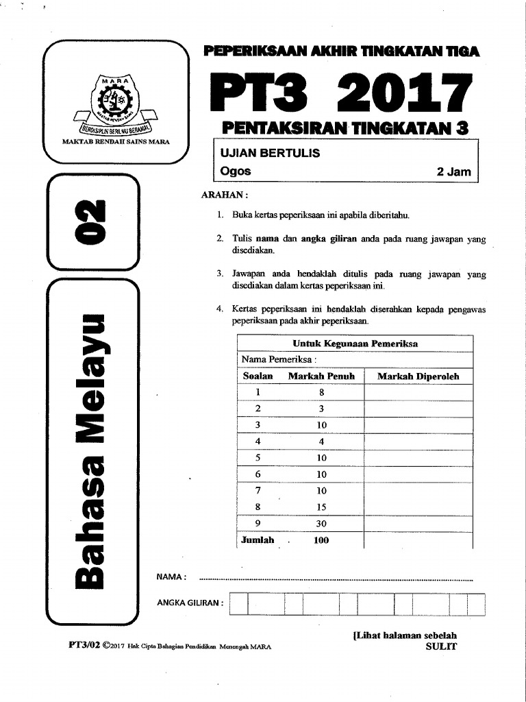 Saya kongsikan contoh soalan instrumen bagi PT3 Pentaksiran Tingkatan 3 yang akan mula digunapakai pada tahun 2014. PT3 Tingkatan 1 2 3 Koleksi Contoh Karangan Bahasa Melayu BM. PT3 ialah Pentaksiran Pusat PP yang dilaksanakan secara perkongsian akauntibiliti antara Lembaga Peperiksaan LP dengan pihak sekolah.